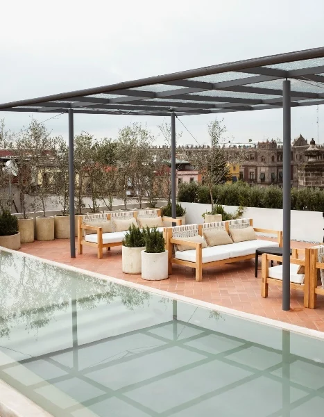 Fiel al estilo minimalista de este hotel boutique de Grupo Habita, en un edificio del siglo XIX, la alberca es un espejo de agua en pleno Centro Histórico. En la terraza predominan los colores blanco y negro en mobiliario, y destaca la decoración con lavanda. Desde aquí puedes contemplar la Catedral Metropolitana y el Templo Mayor.