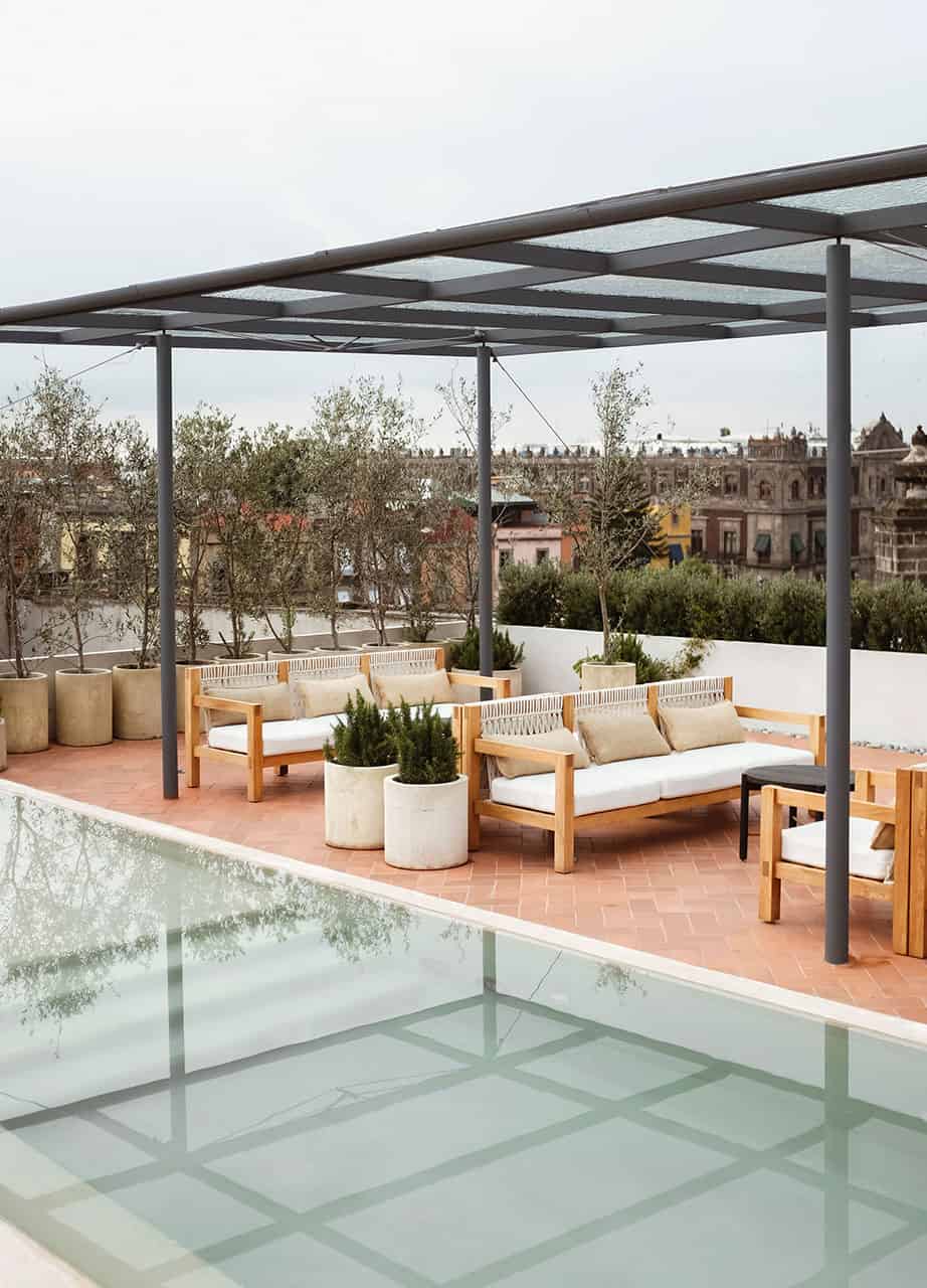 El espacio: como ya es costumbre, la estrella del hotel de Grupo Habita es la terraza. Con una de las mejores vistas de la Catedral, el Palacio Nacional, el Templo Mayor y la Torre Latinoamericana; el espacio abierto invita a disfrutar la alberca en un día soleado en la capital. En la noche se puede degustar una selección de vinos orgánicos, mezcales y aguas frescas en el restaurante Ona Le Toit, a cargo del chef Romain Tischenko y la sommelier Ioulia Gourieva.