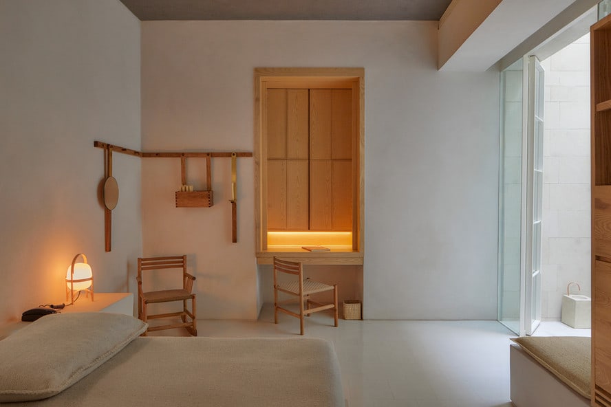 Como una oda a Manuel Álvarez Bravo, el espacio juega con filtros, encuadres y fuentes de luz. En el interior de los dormitorios, la luz rebota en canteras blancas, elementos de vegetación y reflejos de agua. El mobiliario mínimo fue diseñado en colaboración con La Metropolitana y se convierte en parte de un juego que invita al huésped a reflexionar sobre la idea de que menos es suficiente.